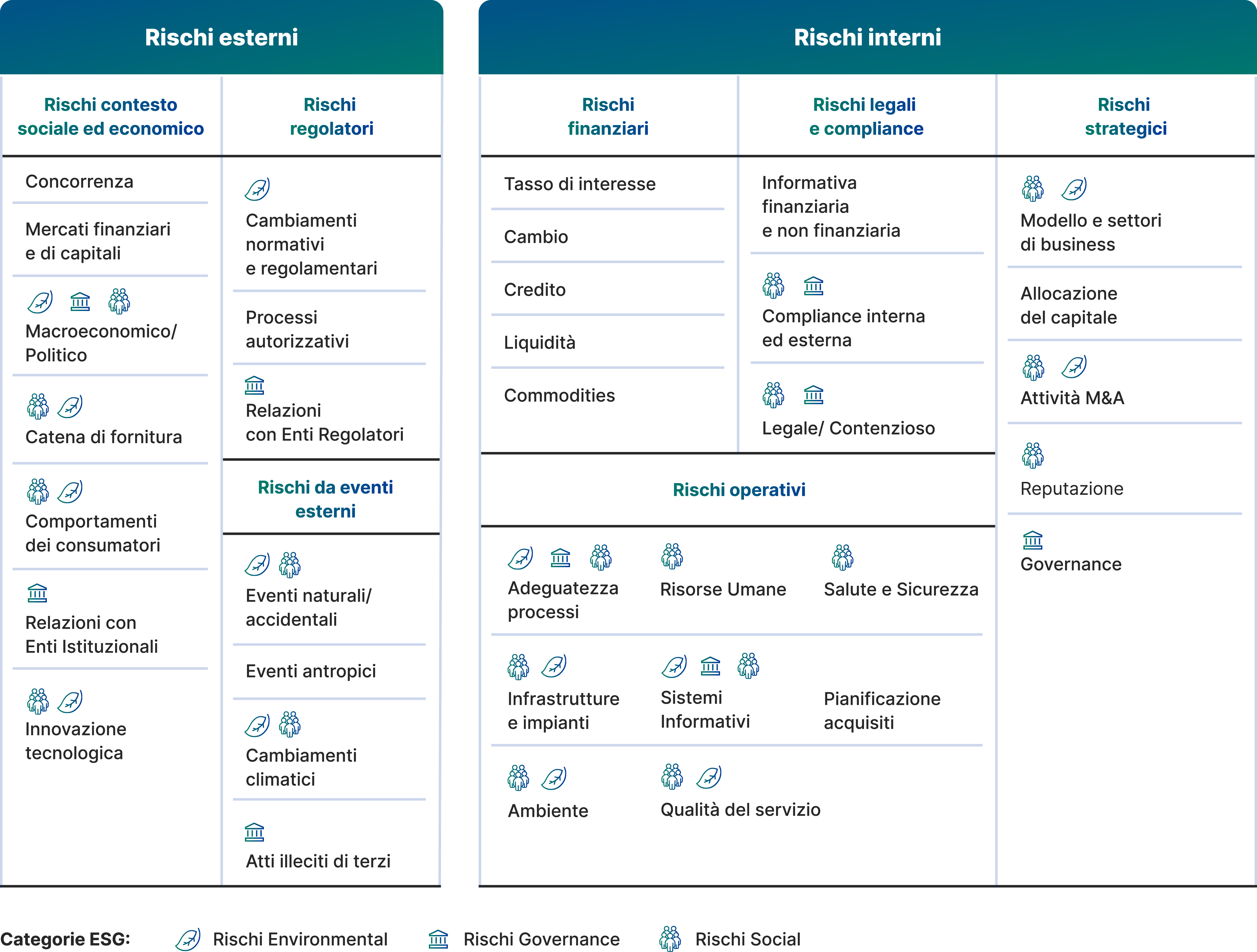 Per ciascuna categoria di rischio, prevista nella Risk Map di Gruppo, sono valutati gli impatti ambientali, sociali e di governance (ESG) ma anche quelli relativi al cambiamento climatico.