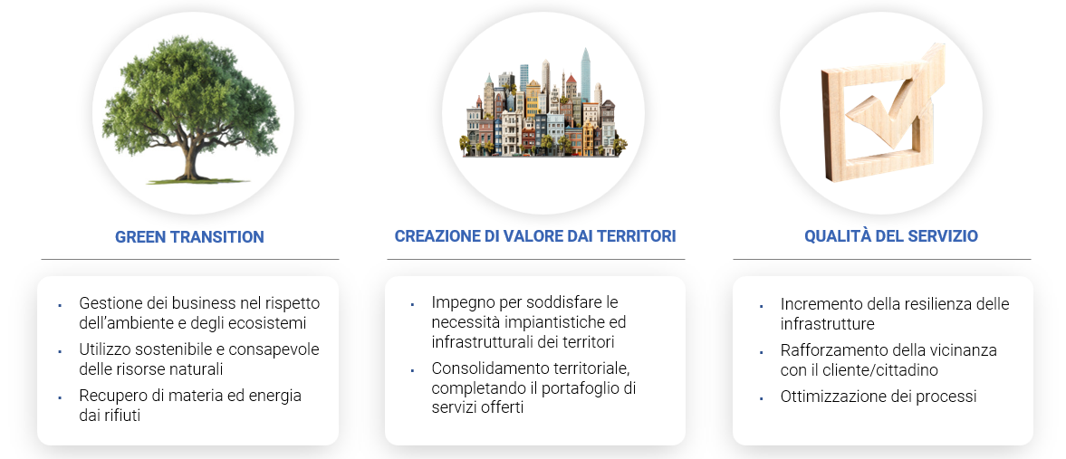 I tre pilastri strategici individuati nei precedenti piani industriali continuano a rappresentare il quadro di riferimento per le scelte di allocazione del capitale e incarnano i valori guida del Gruppo. Transizione ecologica, valorizzazione dei territori e qualità del servizio restano gli assi portanti del nostro percorso di sviluppo, oggi interpretati alla luce delle dinamiche competitive e regolatorie in evoluzione.